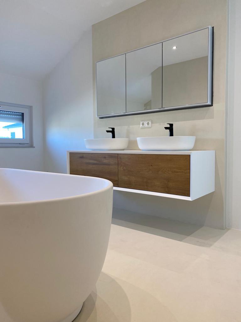 Unser kratzfester Mikrozement basiert auf einem hochwertigen italienischen System mit Lavastein-Technologie und bietet eine deutlich höhere Belastbarkeit als herkömmliche Beschichtungen. Das Ergebnis ist eine nahtlose, moderne Oberfläche, die sowohl ästhetisch als auch funktional überzeugt.