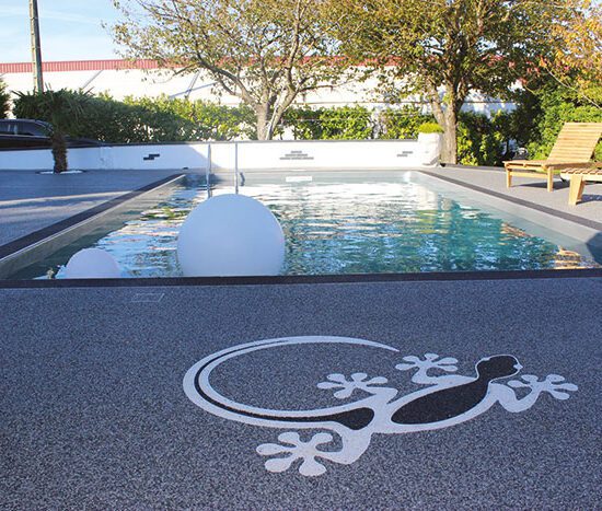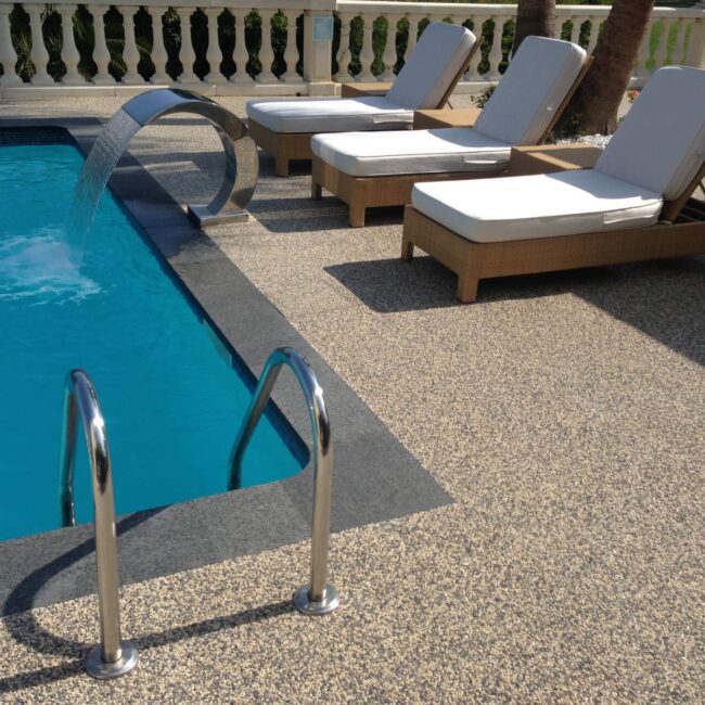 1. Rutschfestigkeit: Auch bei Nässe bietet der Steinteppich eine hohe Rutschfestigkeit, was ihn besonders sicher für Poolbereiche macht.
