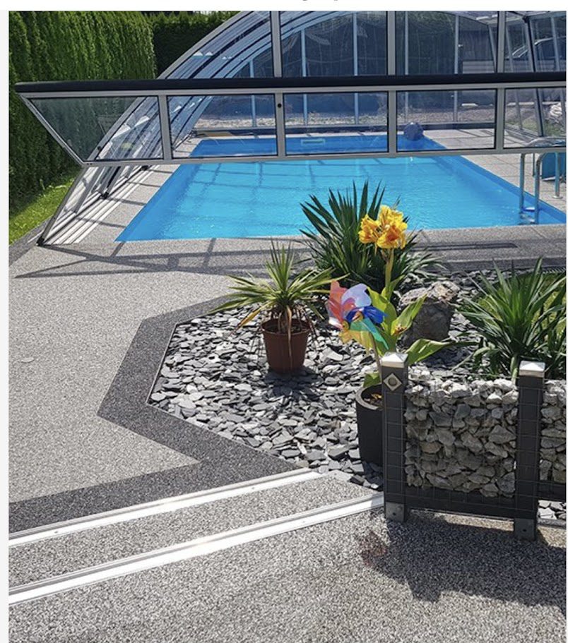 Ein Steinteppich für die Poolumrandung ist eine ausgezeichnete Wahl, um den Bereich um den Pool sowohl ästhetisch ansprechend als auch funktional zu gestalten. Dieser Bodenbelag besteht aus kleinen Natursteinen, wie Marmorkies oder Quarzkies, die mit einem speziellen Bindemittel (meist Harz) vermischt werden. Diese Mischung ergibt eine strapazierfähige, pflegeleichte und rutschfeste Oberfläche, die besonders gut für den Außenbereich und den Einsatz rund um den Pool geeignet ist.
