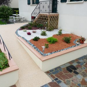 Im Gartenbereich wird er niemals mit Gras, Moos oder Unkraut bewachsen. Im Außenbereich wird die zu bearbeitenden Stelle zuerst mit Flüssigkunststoff nivelliert und abgedichtet. Nun werden die kleinen Mamorsteinchen mit einem geruchslosen, lösemittelfreien Bindemittel vermengt und mit einer Auftragshöhe von 6-10 mm aufgetragen. Bei der Verlegung entsteht kein Staub oder Dreck. Nach 12-24h ist die Fläche wieder voll begehbar. Das Design des Steinteppichs ist sehr vielseitig personalisierbar.