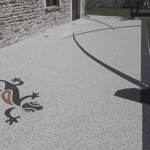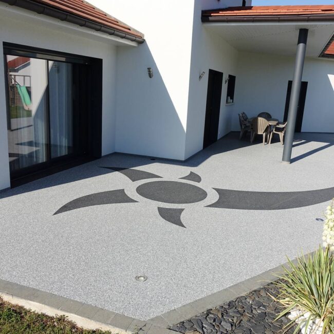 Ein Steinteppich besteht aus Natursteinkörnern, die mit einem speziellen Bindemittel wie Epoxidharz oder PU-Harz vermischt und fugenlos verlegt werden. Durch die große Auswahl an Farben und Korngrößen lassen sich individuelle Designs und Muster in den Boden einarbeiten. Dabei können Motive wie geometrische Formen, Blumen, Ornamente oder sogar persönliche Logos und Symbole in die Terrasse integriert werden. Vorteile von Steinteppichen mit Motiven **Individuelle Gestaltung** Mit einem Steinteppich können Sie Ihre Terrasse ganz nach Ihren Vorstellungen gestalten. Ob klassische Muster, florale Ornamente oder moderne geometrische Designs – Motive bringen Leben und Stil in Ihren Außenbereich und machen Ihre Terrasse zu einem echten Hingucker.